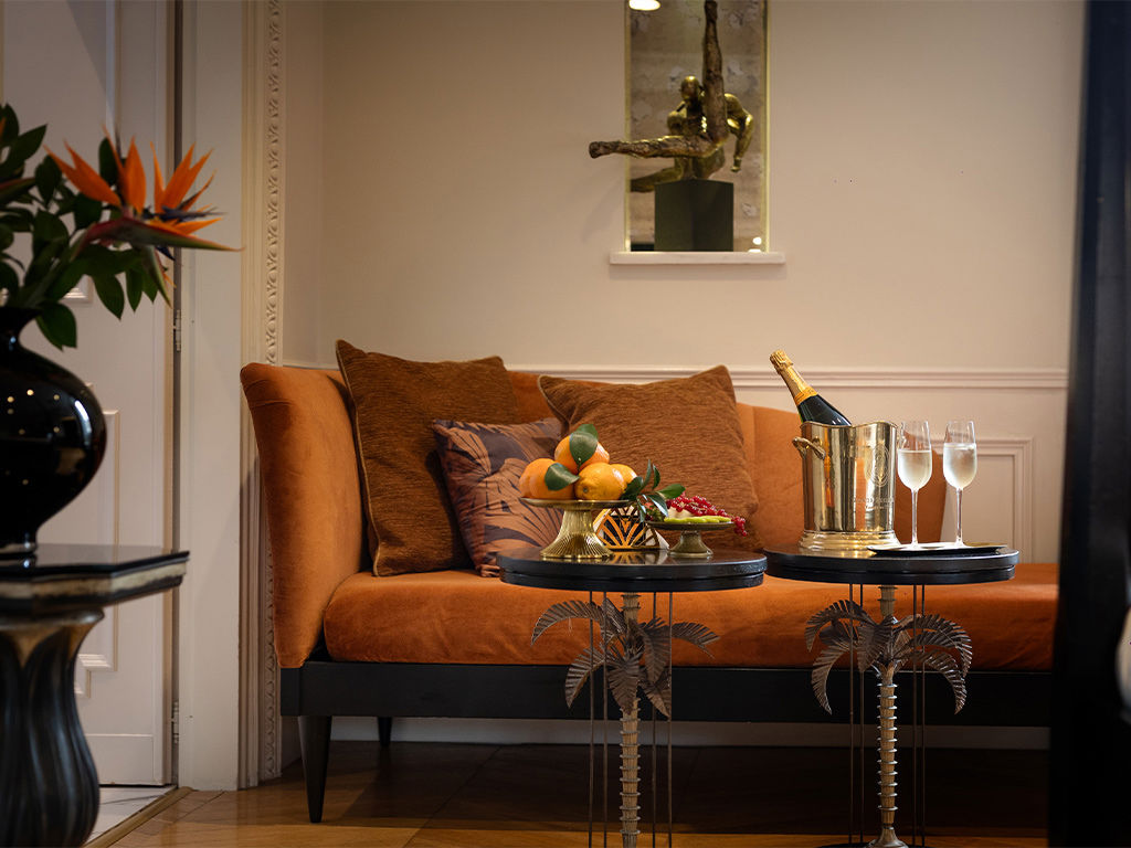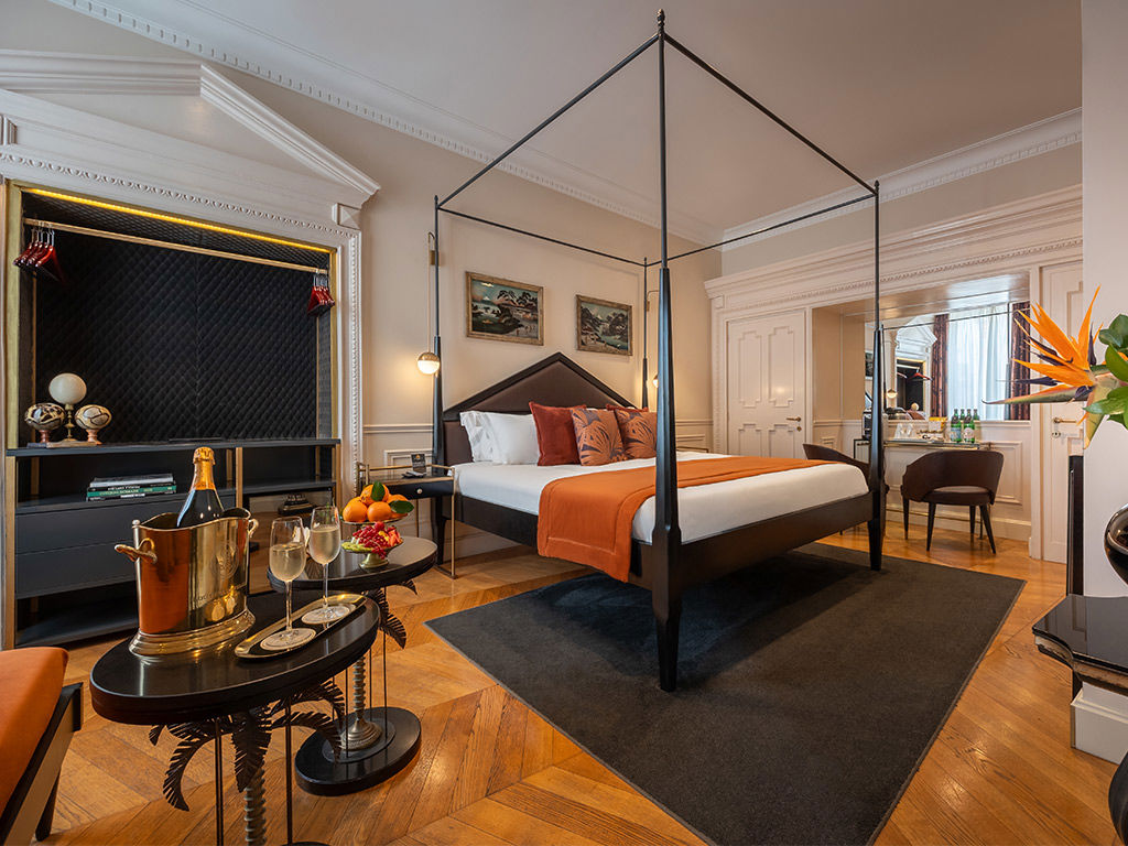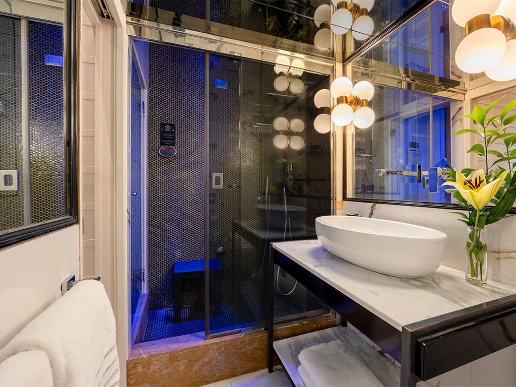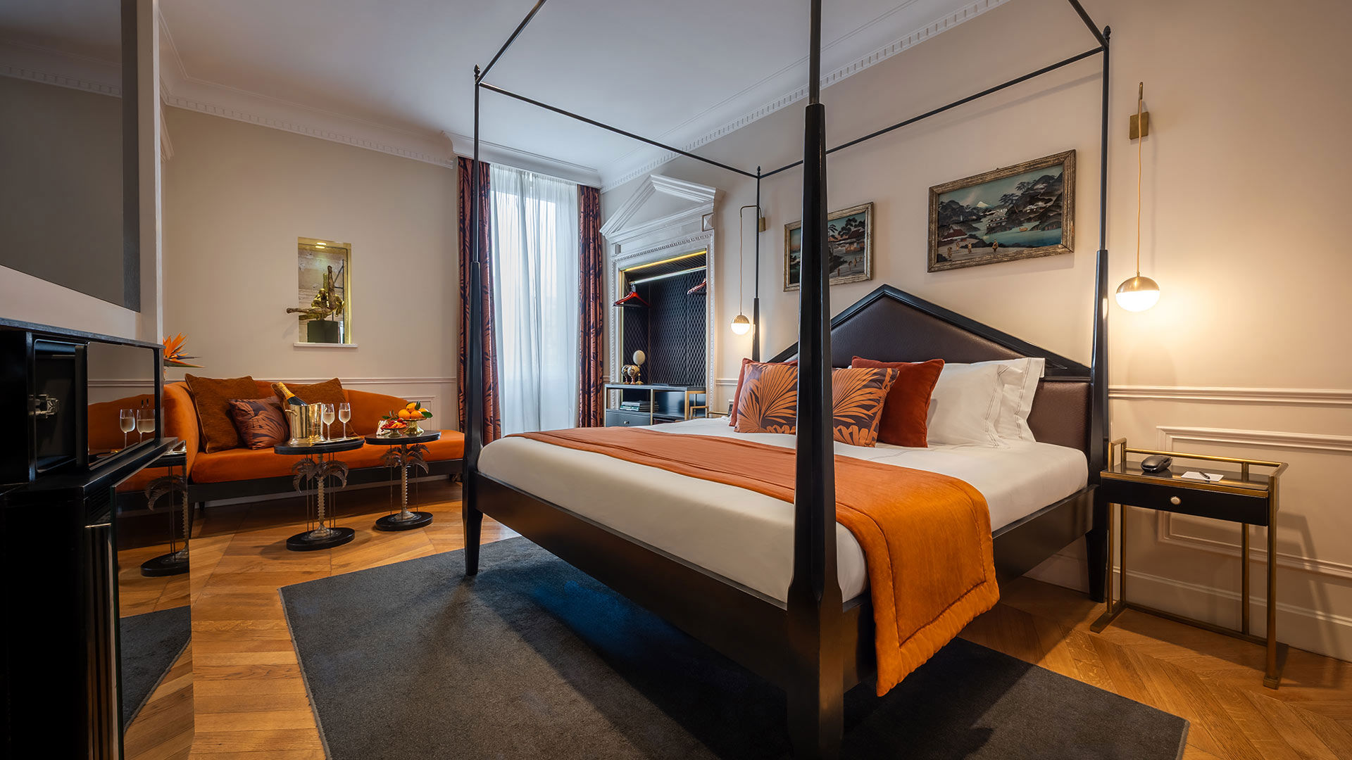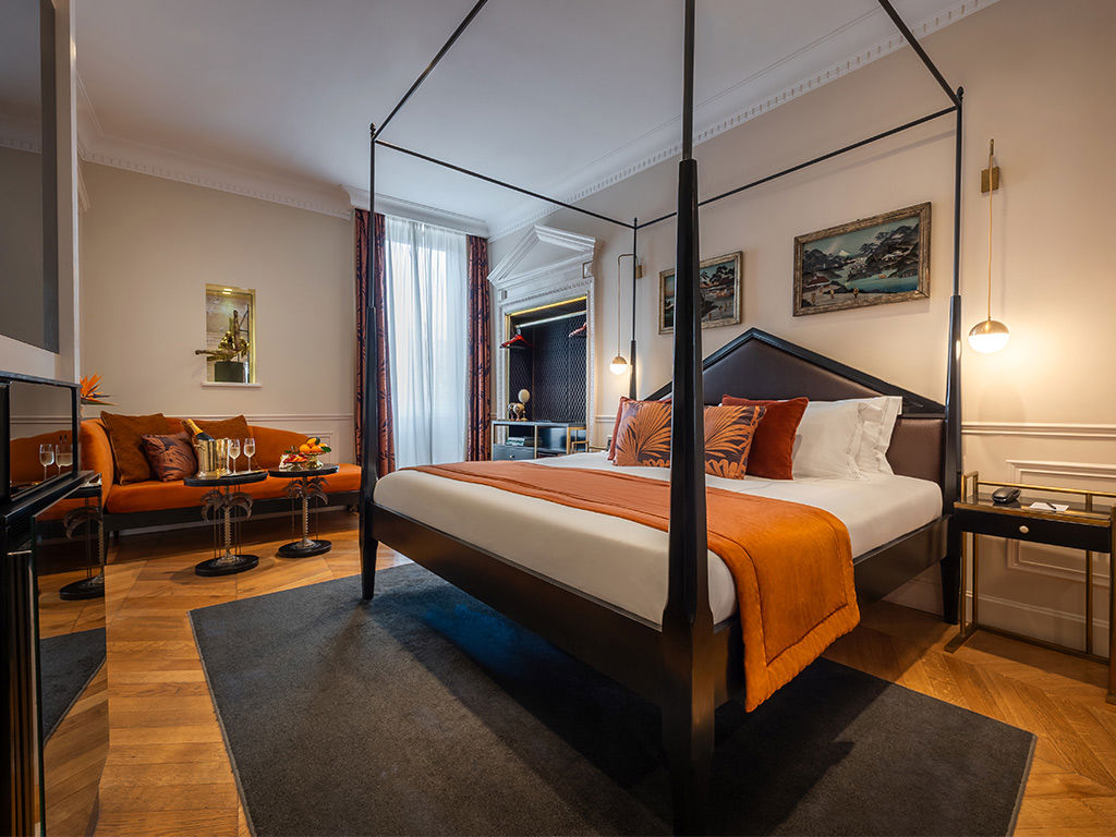 Chambre de 50 m² composée de deux pièces, dont l'une est une lucarne où un troisième lit peut être ajouté. La suite dispose également d'un SPA privé composé d'un jacuzzi rond avec vue sur le Largo di Torre Argentina, d'un sauna finlandais, d'une douche chromothérapie, d'une zone de relaxation et d'un vélo d'appartement.